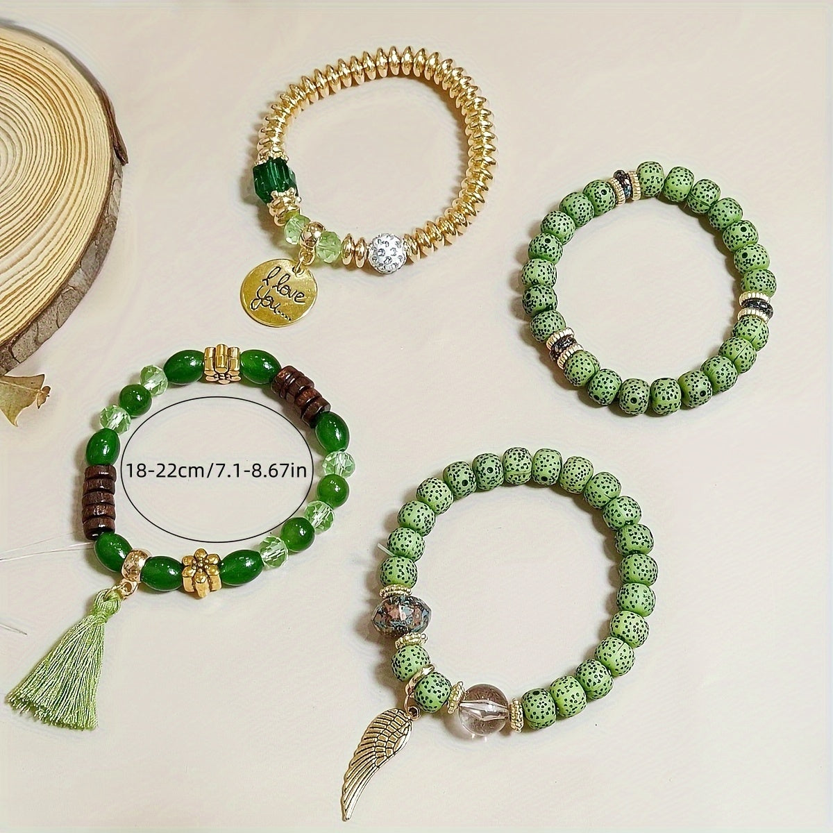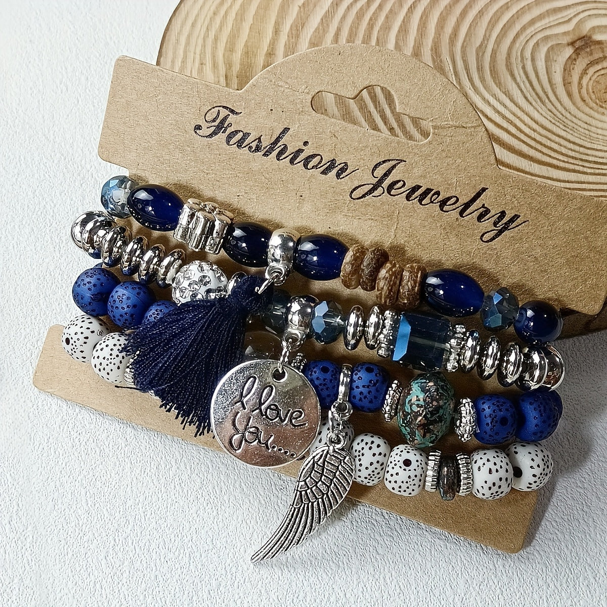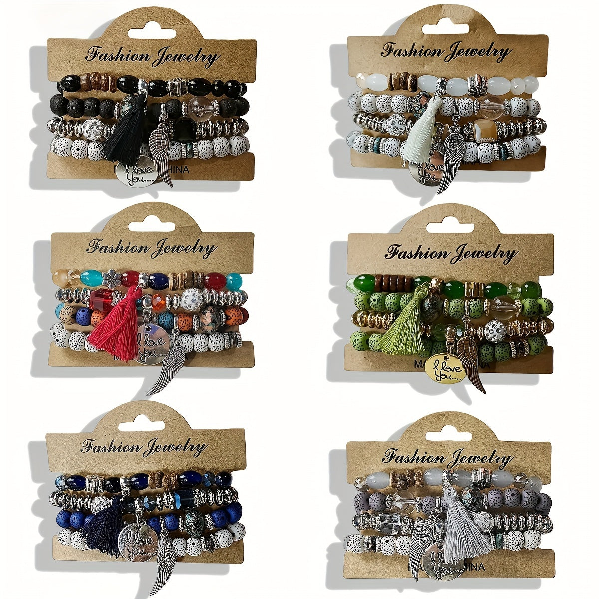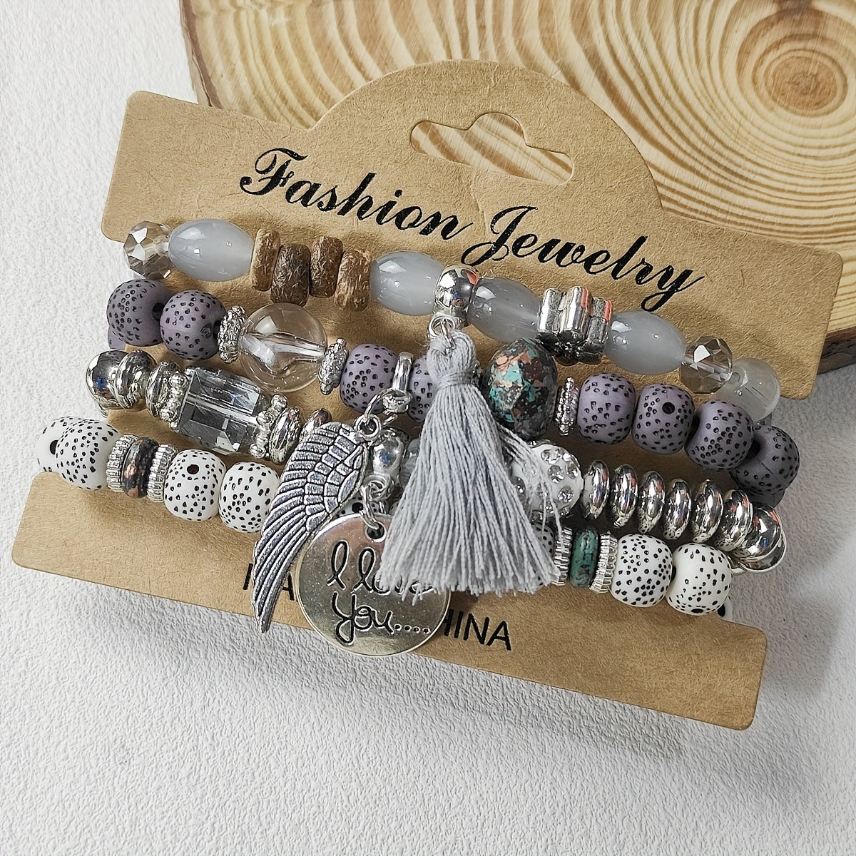 Introducing the 4 Pieces Set Bohemian Wing Round Tassel Multilayer Glass Beads Retro Bracelet, an enchanting collection designed for women who embrace leisure and vacation vibes with style! This exquisite jewelry gift is perfect for those who adore the Boho aesthetic. Crafted with care, these bracelets feature stunning glass beads and charming tassels, making them a standout choice in the world of women's fashion jewelry.