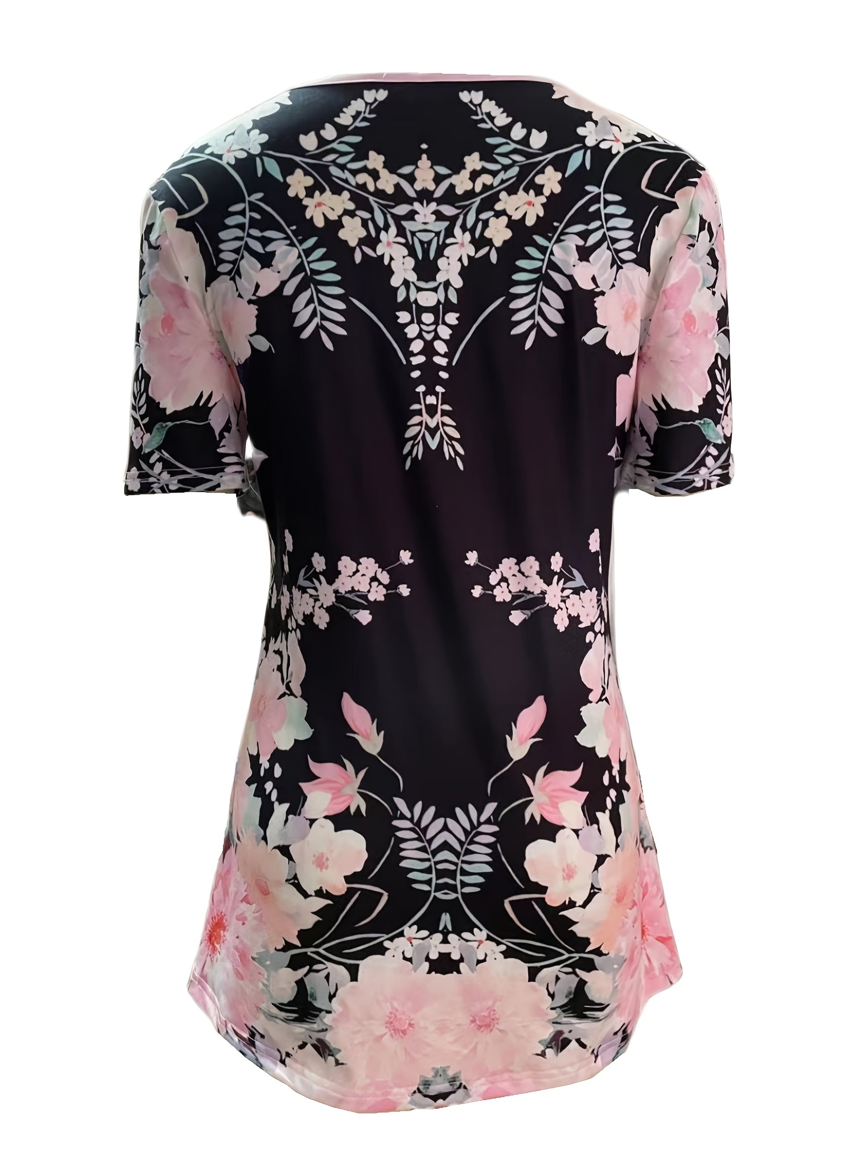 Elevate your summer wardrobe with our Floral T-Shirt, a stunning women's V-neck top that combines style and comfort seamlessly. Crafted from a high-quality polyester blend, this layered black and pink casual short sleeve top is designed to keep you cool and chic during those warm sunny days.