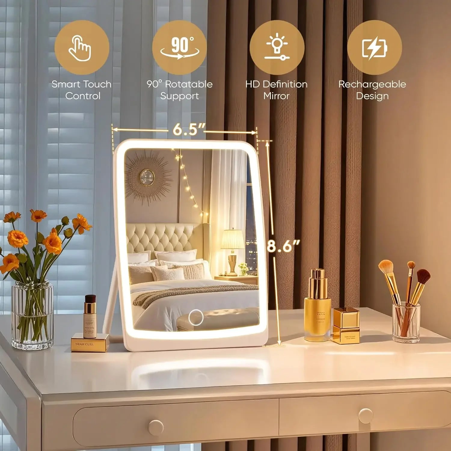 - Integrated LED illumination provides steady, energy-efficient light that reduces shadows, preserves color accuracy, supports every step of your routine from skincare to makeup, and offers dimmable brightness.
