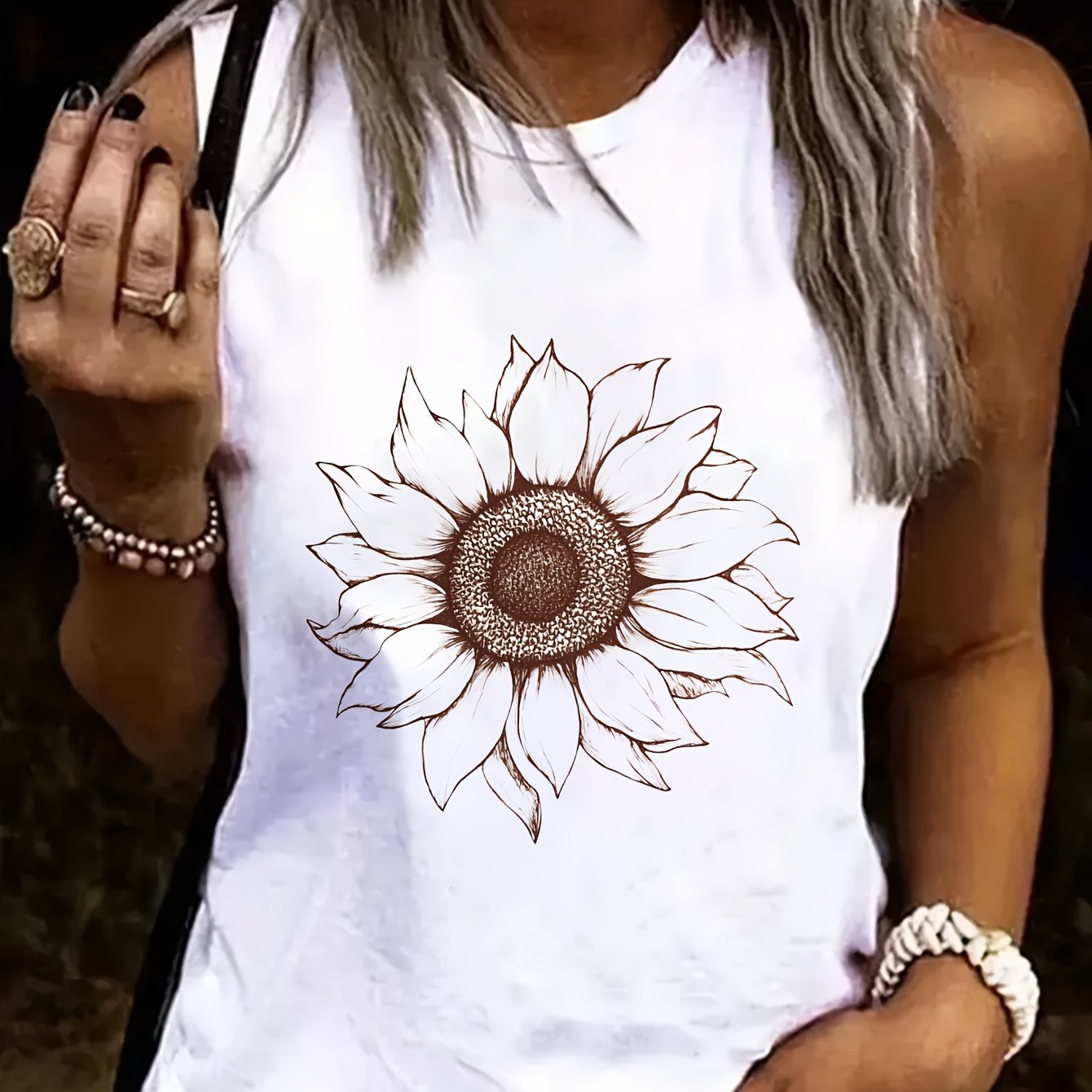 Don't miss out on this stylish staple! Add the Women's White Sleeveless Tank Top with Artistic Sunflower Design to your cart today and step into summer with confidence and style!